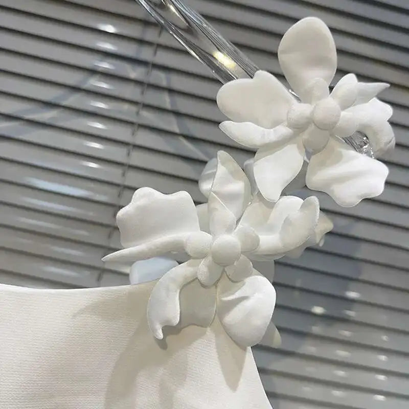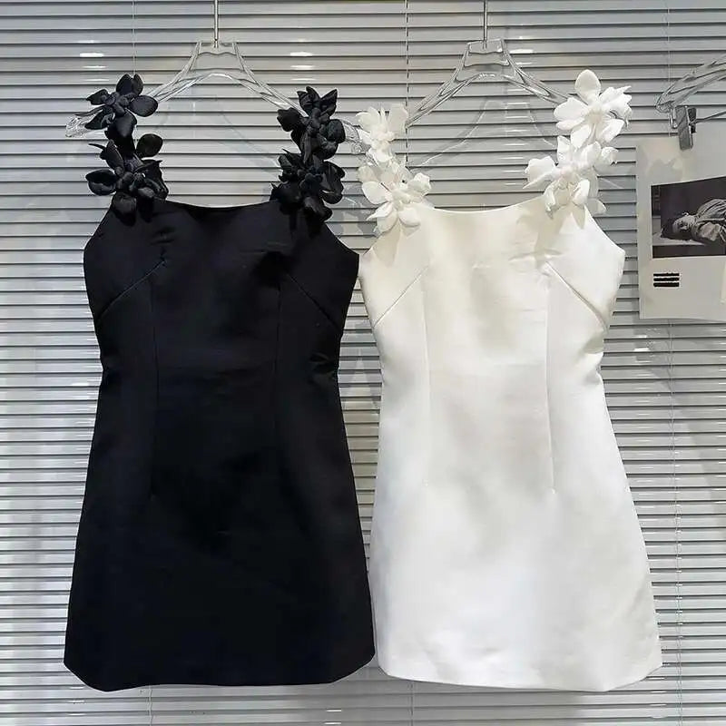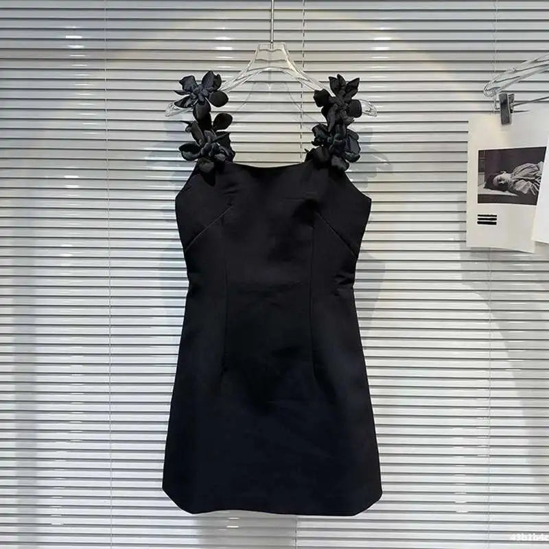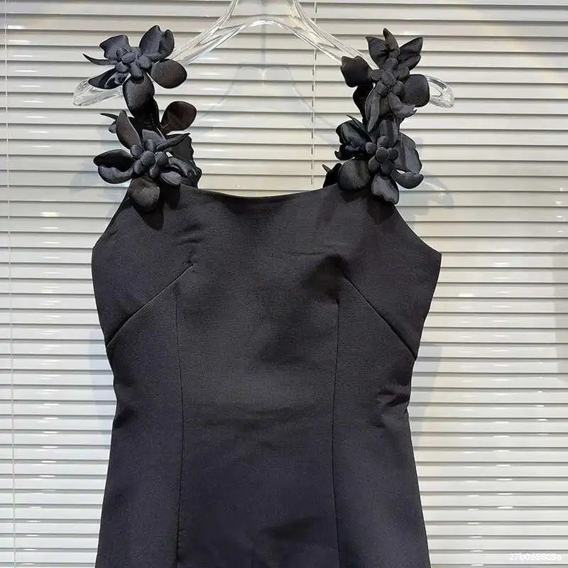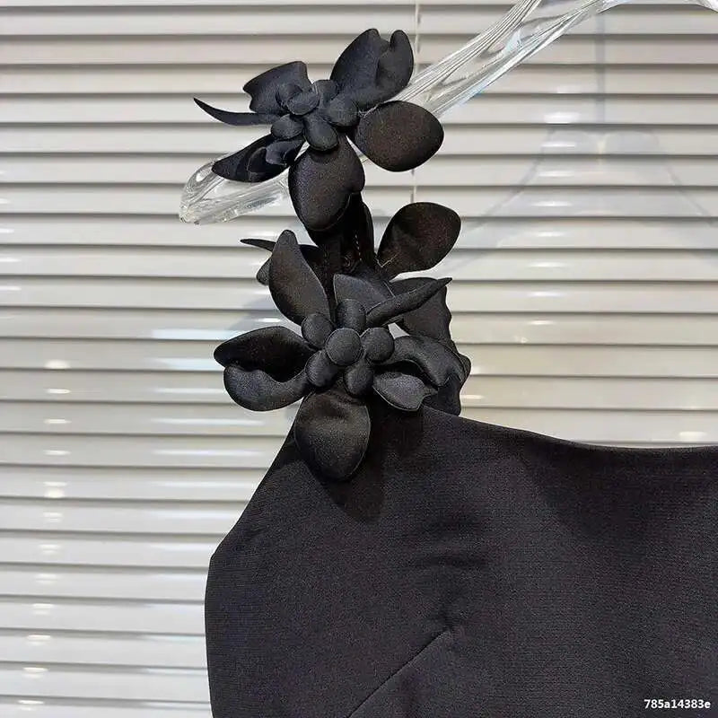 שמלת ערב שחורה עם כתפיות פרחוניות תלת־ממדיות – שילוב מנצח של רכות, יוקרה וסטייל בלתי נשכח.